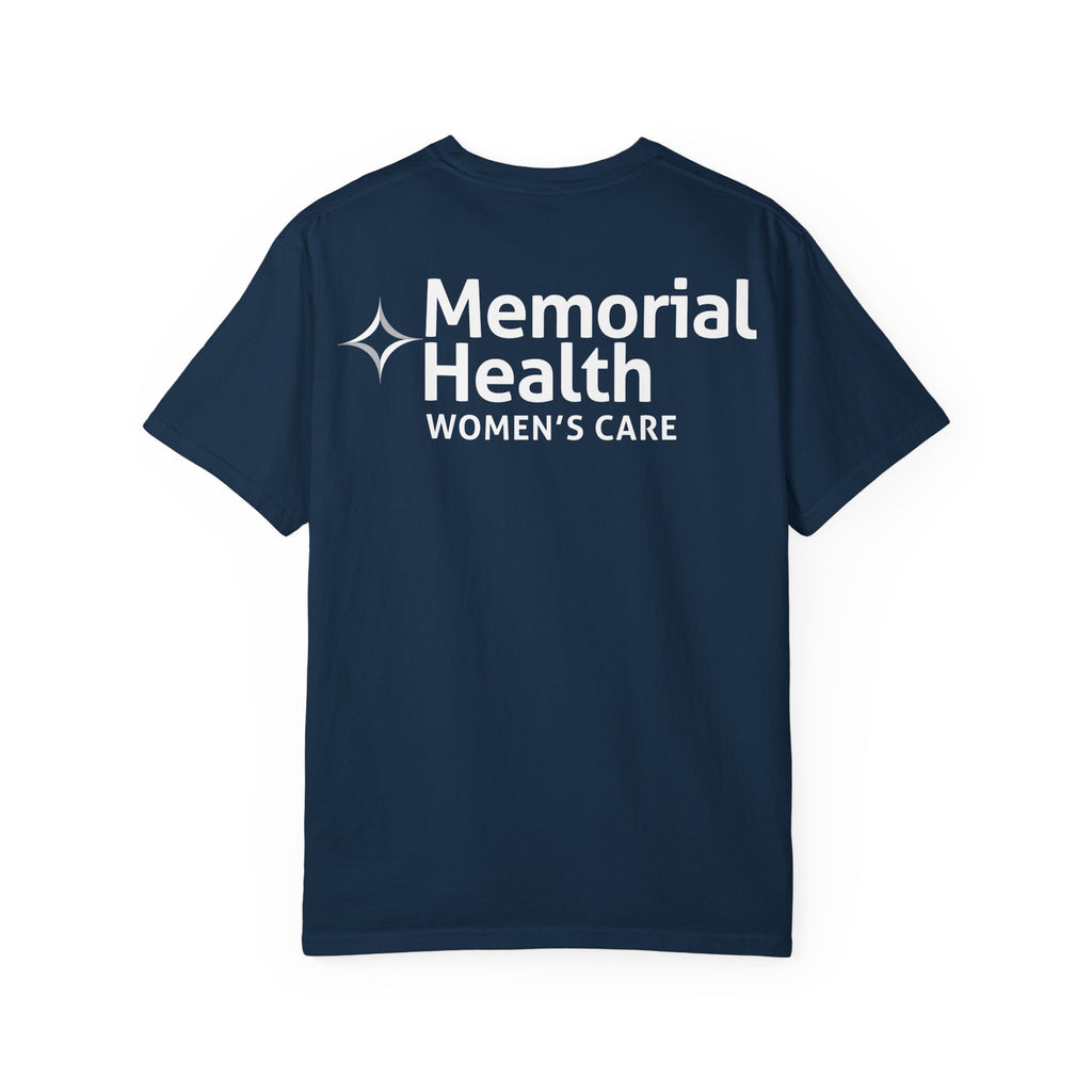 This garment-dyed tee feels lived-in from the first wear. Washed-deep navy and a soft, broken-in hand make it an easy go-to after long shifts or busy days at the clinic. The clean, white logo on the chest and a larger version across the back read clearly without shouting — professional, approachable, and quietly proud. The relaxed cut lets you move freely during rounds, and the breathable 100% ring-spun cotton breathes through hectic shifts and errands alike. Wear it with scrub pants, jeans, or under a cardigan for layering on cooler mornings. It settles into your rotation and keeps its color and shape wash after wash.